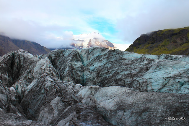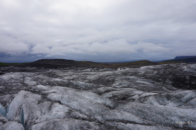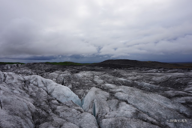 我們在走的時候有聽到兩聲很像打雷的聲音, 我原先以為是要開始下雨了, 但是導遊說, 這是底層的冰在崩裂, 他說:"各位, 溫室效應正在我們眼前發生, 五十年後冰島都沒有冰了..." 在上冰原前, 我也有看到邊緣的冰原正崩下一大塊, 我們真的要好好愛護我們的環境阿~