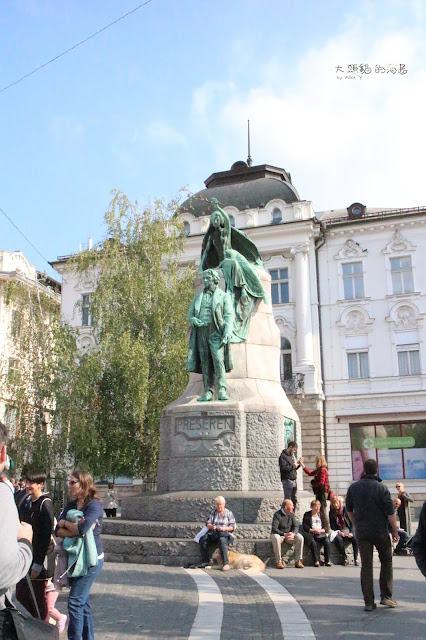 至於為什麼這個廣場叫做普雷雪倫廣場? 法蘭斯普雷雪倫(France Prešeren)其實是斯洛維尼亞的詩人, 他的其中一首詩就是今天斯洛維尼亞的國歌, 普雷雪倫廣場上當然就有普雷雪倫的雕像了