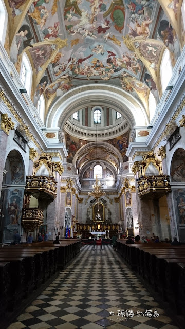 這個教堂建於13世紀, 但也是到了18世紀才成為現在的樣子. 教堂頂上是巴洛克式的濕壁畫
