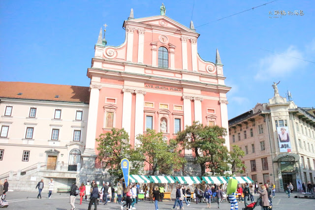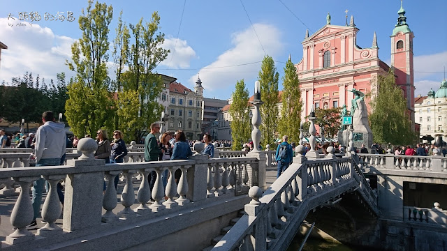 在方濟會報喜教堂前方跨越著盧布里亞納河的是三重橋 (Triple Bridge), 顧名思義就是一座三座橋連在一起的橋, 建築師普雷契尼克(Jože Plečnik) 原本建造時只有中間那座橋, 後來又加建的旁邊那兩座.