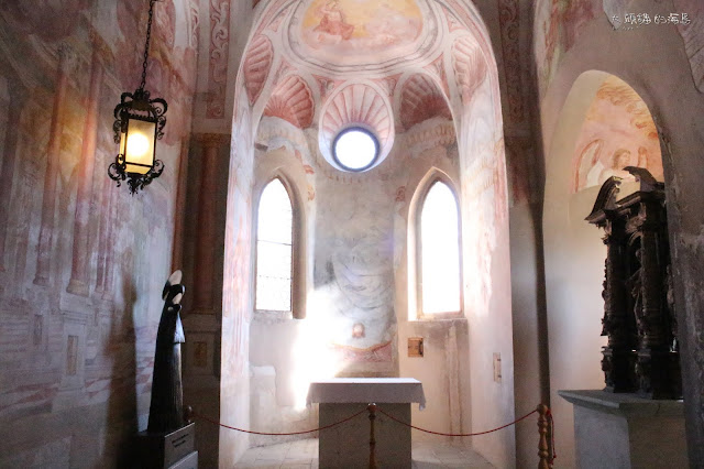 哥德式(Gothic)的禮拜堂建於16世紀, 牆上還留有原本的濕壁畫