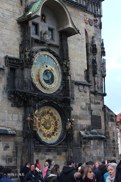 廣場上最有名的大概是這個15世紀的天文鐘了(Orloj), 大家都慕名而來看它, 我的感想是它的確是一個很漂亮很有藝術感的鐘, 但我看不懂那堆複雜的圈圈跟標示... 總之這個鐘上標示了時間, 日期, 白天, 夜晚, 甚至黃道十二宮...