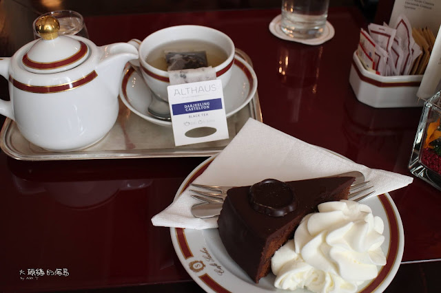 享有盛名的沙赫蛋糕(Sachertorte)--濃郁的微苦巧克力蛋糕裡面夾有微酸甜的杏子醬, 旁邊附有不甜的奶油可自由搭配蛋糕~💗