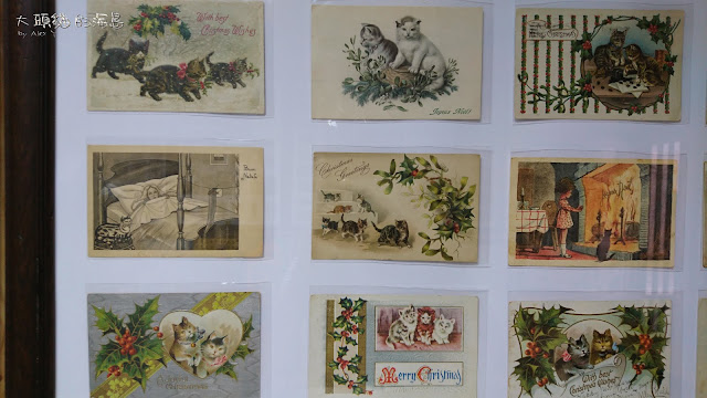 博物館內展示貓咪的卡片跟畫報, 還有早期報紙上以貓為主題的故事跟照片