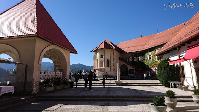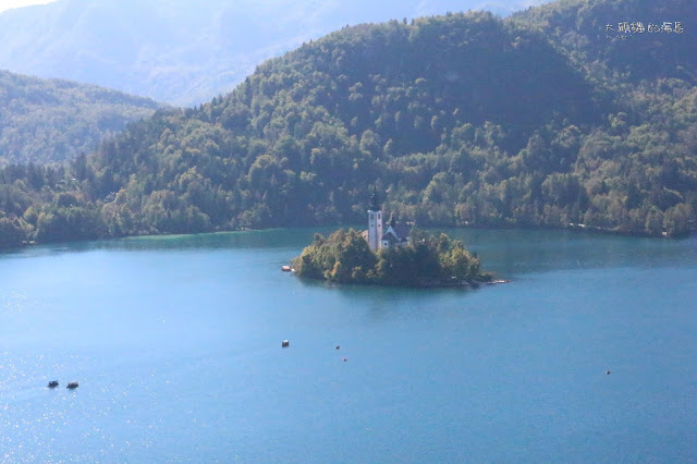 布列德湖邊可以看到兩個大的建築物, 一個在丘陵上面的是布列德城堡(Castle Bled)